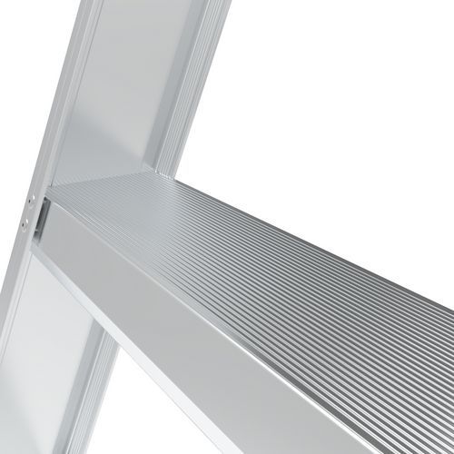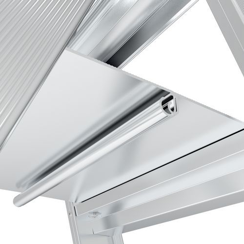 Miniescadote de plano duplo em alumínio com sistema antiafastamento como apoio para os pés para um conforto ideal. Os perfis abertos” proporcionam leveza e facilidade de manuseamento. Bloqueio antiafastamento na parte superior para ultrapassar obstáculos. Degraus com 80 mm de profundidade. Montantes robustos com perfis abertos fáceis de manusear. Dobragem total para uma ocupação mínima de espaço. Também disponível com balaustrada de segurança rebatível extremamente compacta. Miniescadote de acesso duplo, utilizável pelos dois lados.