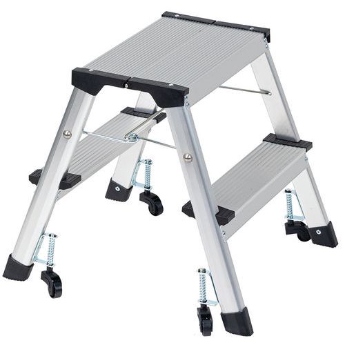 Miniescadote dobrável de duplo acesso em alumínio. Confortável e seguro com degraus estriados. 4 rodízios: fácil de deslocar.