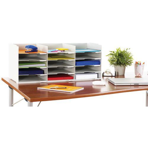 Organizador multicompartimentos para arrumar na horizontal os seus documentos A4. Um porta-etiqueta por compartimento para uma identificação rápida. Fabricado na UE