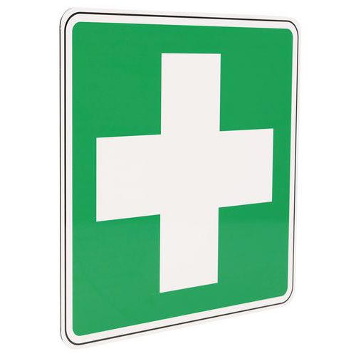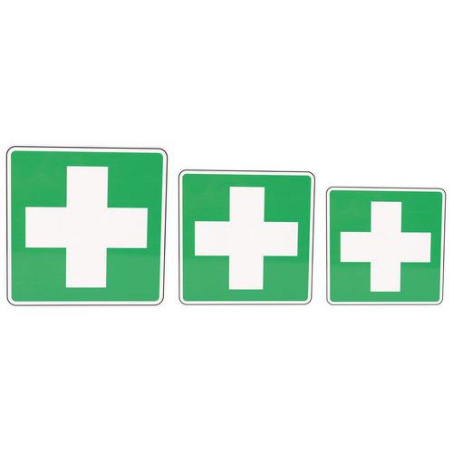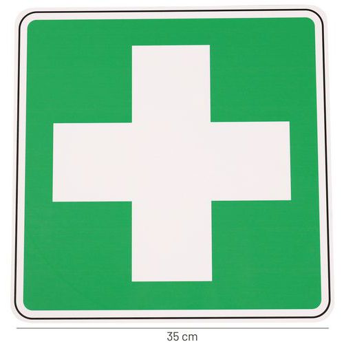 Pictograma com símbolo de primeiros socorros para localização rápida dos equipamentos de emergência.
