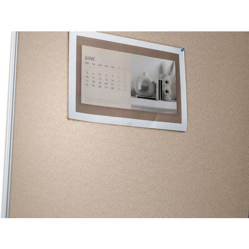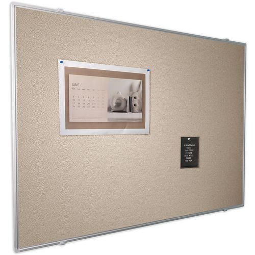 Painel de exposição têxtil furável. Superfície de alta qualidade 100% reciclada. Vasta gama de cores para o fundo. Material em alumínio anodizado de qualidade. Perímetro com perfis e cantos de plástico. Manutenção fácil. Resistente ao fogo.