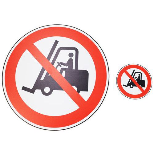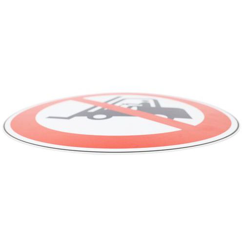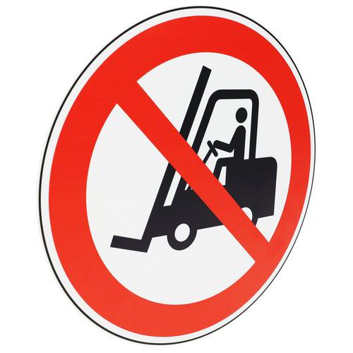 Painel de sinalização, modelo Proibido a veículos industriais. Em PVC com 1 mm de espessura. Ideal para espaços interiores. Tratamento de proteção antifogo M1. Leve e fácil de fixar.