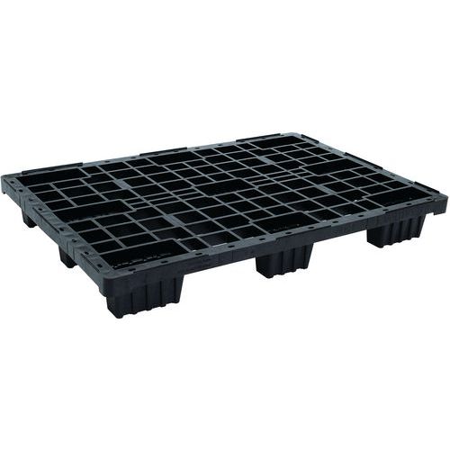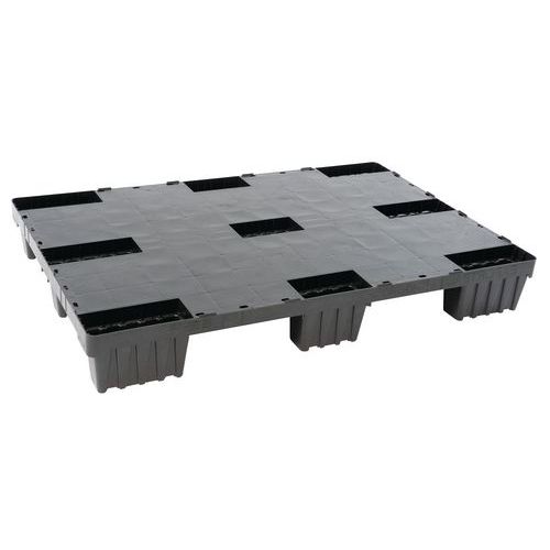 Paletes leves de 800 x 600 mm, 1200 x 800 mm e 1200 x 1000 mm em cor preta com plataforma integral ou gradeada e um rebordo de segurança interrompido de 5 mm. As paletes são leves, robustas e encaixáveis.