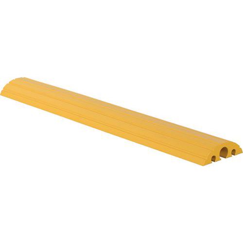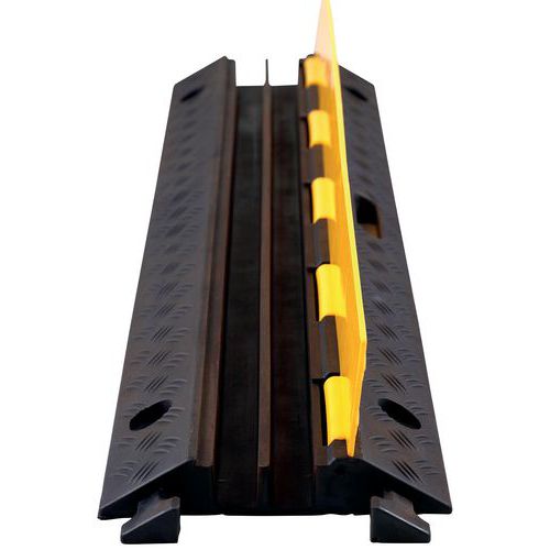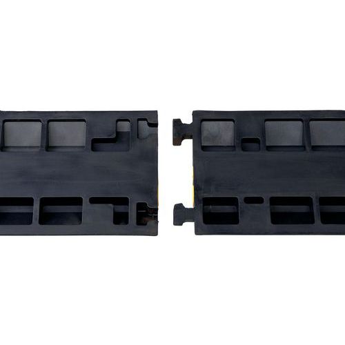 Passa-cabos modular com canais com cobertura de proteção. Montagem simples e segura dos módulos com patilhas de encaixe. Material em borracha maciça preta com cobertura em PE robusta. Borracha tingida na massa: resistência ao frio e ao tráfego intenso. Calha perfilada para um deslizamento perfeito dos veículos ao passar.