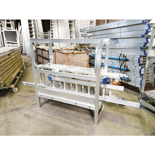 Passadiço robusto em alumínio para trabalhos em altura com toda a segurança. Extremamente estável graças aos dois estabilizadores reguláveis com pés rotativos. Ocupação de espaço reduzida com uma parte em escadote desmontável (balaustrada de segurança fixa).