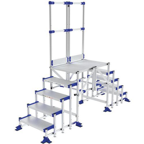 Passadiço fixo em alumínio com duas entradas e altura do acesso pequena. Seguro: 1 balaustrada de segurança integrada para maior segurança antiquedas. Estável, com uma grande plataforma e degraus profundos antiderrapantes. Passadiço de fixação ao solo, caso necessário, com pés grandes de fixação dupla. Estrutura muito resistente e adequado para utilizações intensivas em pavimentos planos. Confortável, evolutivo, polivalente e adaptável a todos os tipos de necessidades. Pés com fixação dupla, parafusos de Ø 8 mm (não fornecidos). Balaustrada de segurança com rodapé integrado (altura de 100 mm).