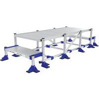Passadiço fixo em alumínio com duas entradas e altura do acesso pequena. Confortável e seguro, evolutivo, adaptável a todos os tipos de necessidades. Estável, com uma grande plataforma e degraus profundos antiderrapantes. Passadiço de fixação ao solo, caso necessário, com pés grandes de fixação dupla. Estrutura muito resistente e adequado para utilizações intensivas em pavimentos planos. Pés com fixação dupla, parafusos de Ø 8 mm (não fornecidos).
