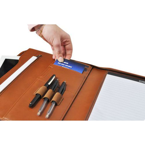 A pasta para conferências Business Classy é fabricada à mão com couro sintético de elevada qualidade num design neerlandês (Dutch Design). Com 8 bolsas e aberturas para guardar utensílios, tais como canetas, cartões de visita e documentos. Uma bolsa adequada para um tablet, que também pode ser utilizada para documentos A4. Pasta para conferências A4 DESQ® com bolsa secreta e fecho de correr.