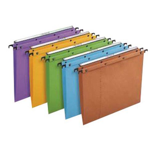 Pasta suspensa kraft Canson de elevada resistência. 100% pura pasta reforçada por fibras de algodão. Tiras de suspensão em aço para uma maior resistência à carga. Porta-etiqueta com efeito lupa.