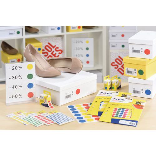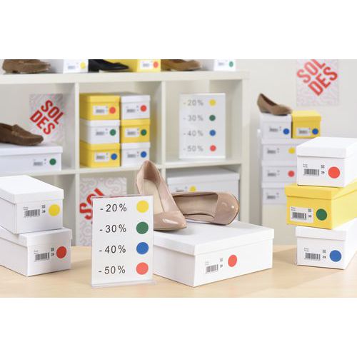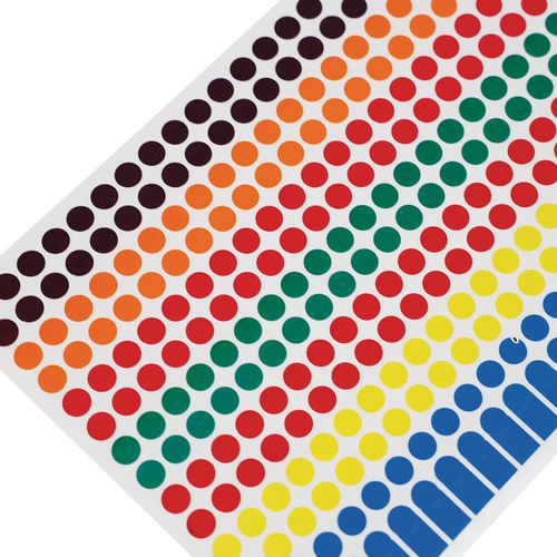 Compatíveis com todas as impressoras a laser e a jato de tinta. Para assinalar, identificar, classificar, codificar e localizar rapidamente. Disponível em várias cores e dimensões. Adesivo permanente.