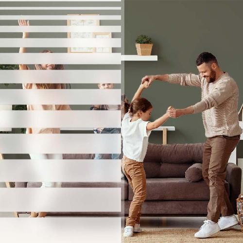 Efeito degressivo único: ocultação progressiva na parte inferior, transparência preservada na parte superior. Privacidade ideal: opacifica ligeiramente as suas superfícies envidraçadas para um nível muito bom de privacidade. Luz maximizada: passagem de luz ideal para um interior sempre luminoso e agradável. Design elegante: faixas brancas em vários tamanhos (de 16,5 cm a 1 cm) para um visual moderno e harmonioso.