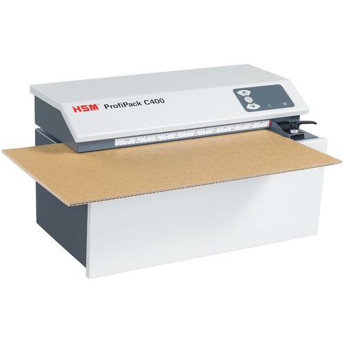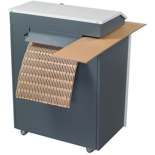 Máquina de acolchoamento para embalagens, que permite transformar num só passo caixas de cartão velhas em revestimentos protetores ou materiais de enchimento acolchoados. Pode ser utilizada de forma móvel e flexível como aparelho de mesa compacto.