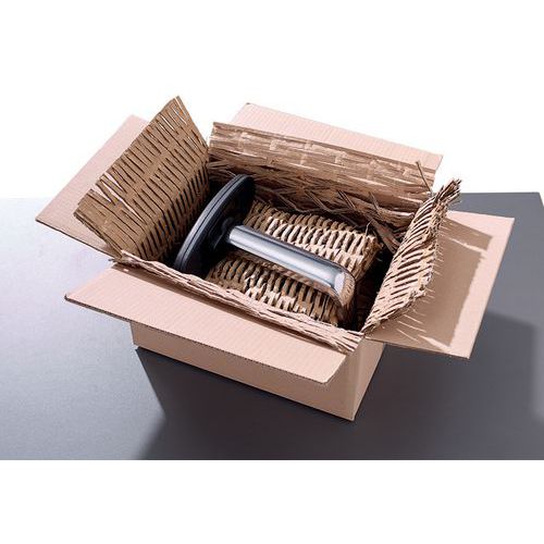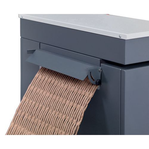 Máquina de acolchoamento para embalagens, que permite transformar num só passo caixas de cartão velhas em revestimentos protetores ou materiais de enchimento acolchoados. Pode ser utilizada de forma móvel e flexível como aparelho de mesa compacto.