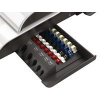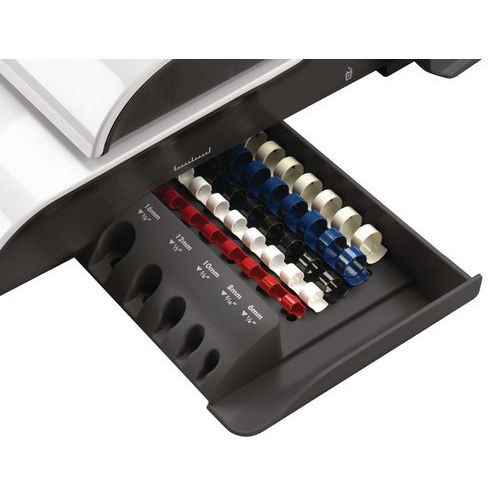 Fácil encadernação graças aos dentes dos suportes do anel inclinados. Batente de alinhamento regulável para alinhar com precisão todos os seus documentos. Perfuradora-encadernadora dotada de uma gaveta de arrumação com carregador de lombada de encadernação e documentos. Abertura automática da gaveta para resíduos para evitar encravamentos. Capacidade de perfuração de 300 páginas com lombada de encadernação de uma dimensão máxima de 38 mm. Para perfurar e encadernar