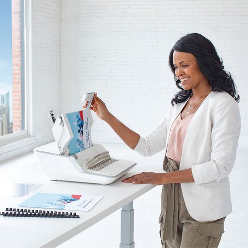 - Perfuradora-encadernadora Lyra™ 3 em 1 fácil de utilizar, para encadernar, agrafar e perfurar documentos.