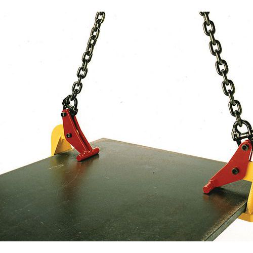 Acessório de elevação para chapas ou placas horizontais. Pinças equipadas com alavanca basculante que assegura a fixação da carga. Coloque a carga no interior das pinças e deixe que o mecanismo de elevação fixe a carga. Compacta e ultraleve.