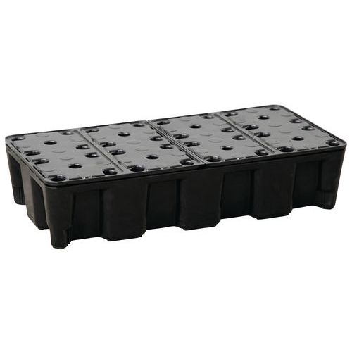 Caixas empilháveis em polietileno. Disponíveis em diferentes tamanhos para criar uma plataforma de retenção. Plataformas gradeadas robustas e amovíveis com superfícies antiderrapantes. Os elementos de ligação (acessórios) asseguram a modularidade da instalação. Posto combinado de armazenamento e abastecimento
