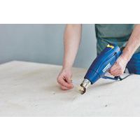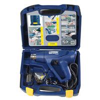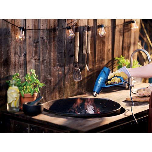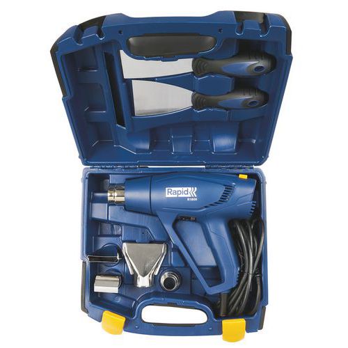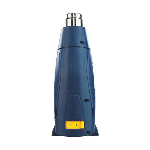 Pistola de ar quente com 2 regulações de débito de ar, proteção da pega, base estável para garantir um trabalho na vertical com ambas as mãos livres, estojo com 2 espátulas e 4 bocais.