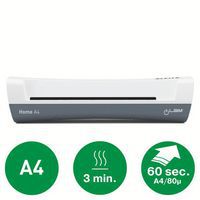 Plastificadora iLam Home A4 Set 4-in-1 da Leitz, com pré-aquecimento rápido em 3 minutos e velocidade de 300 mm/min. Segurança melhorada com sensor de sobreaquecimento e paragem automática. Kit completo com plastificadora, aparador de extremidades, peça para arredondar cantos e bolsas. Fácil de utilizar com indicador LED e alavanca de libertação manual.