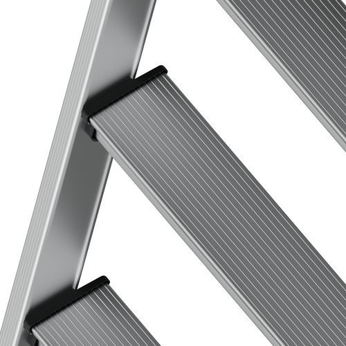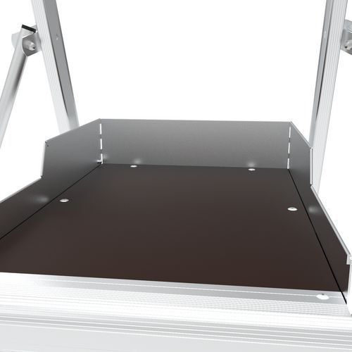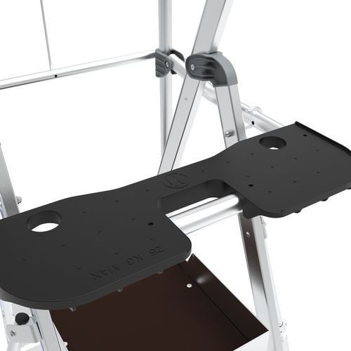 Plataforma de trabalho Sherpamatic. Balaustrada de segurança rígida de 4 lados com travessas de proteção traseiras contra quedas com fecho semiautomático. Degraus antiderrapantes de 80 mm. Inclui um porta-ferramentas amovível com compartimentos e com resistência de 25 kg, com ganchos integrados (máximo de 10 kg). Prateleira XL com resistência de 25 kg. Estabilizadores retráteis com regulação milimétrica. Piso antiderrapante com elevado conforto de 590 x 400 mm em alumínio. Espaço de trabalho ergonómico e confortável. Rodas de deslocação todo o terreno com diâmetro de 175 mm.