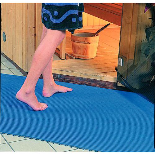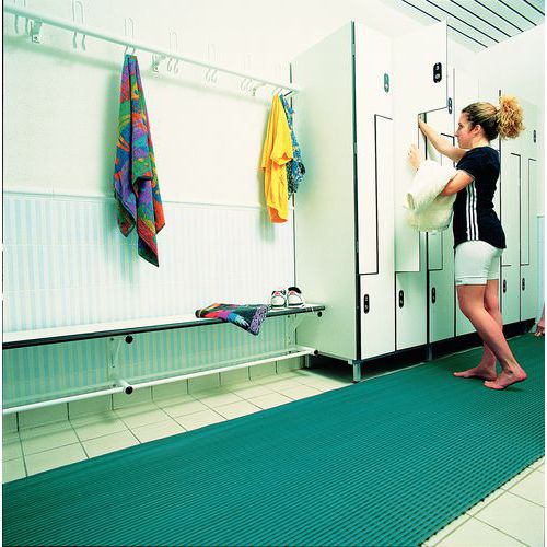 Rolo de plataforma gradeada antiderrapante para espaços coletivos. Higiénica com material não poroso e aditivos antimicrobianos e antifúngicos. Conceção inovadora para uma drenagem ultraeficaz da água. Plataforma gradeada fácil de cortar, instalar e levantar. Relevo antiderrapante para uma estabilidade excelente.