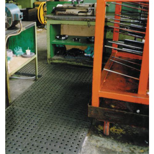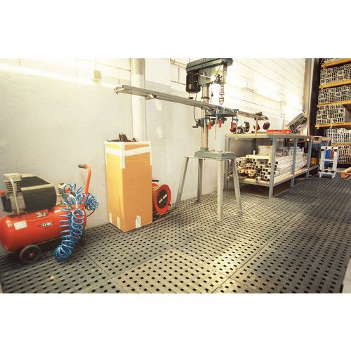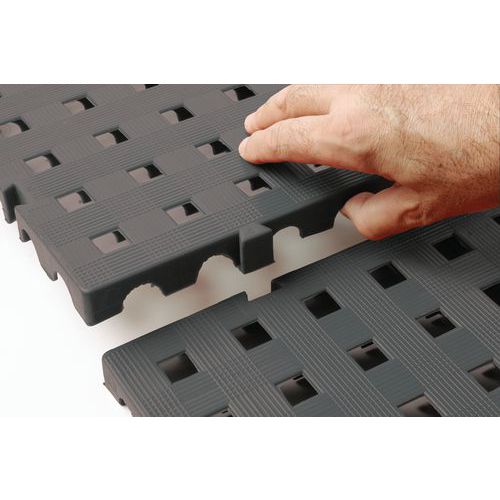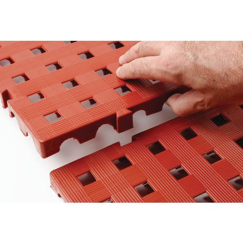 Montagem fácil por simples encaixe. Piso gradeado de elevada resistência isolado dos solos molhados ou gordurosos, graças à sua estrutura espessa. Resistente a temperaturas extremas: frio e até 70 °C. Pode ocorrer uma ligeira variação de tamanho a temperaturas extremas. Manutenção fácil. Fabricado em polietileno de baixa densidade linear (PEBDL).