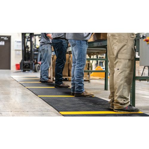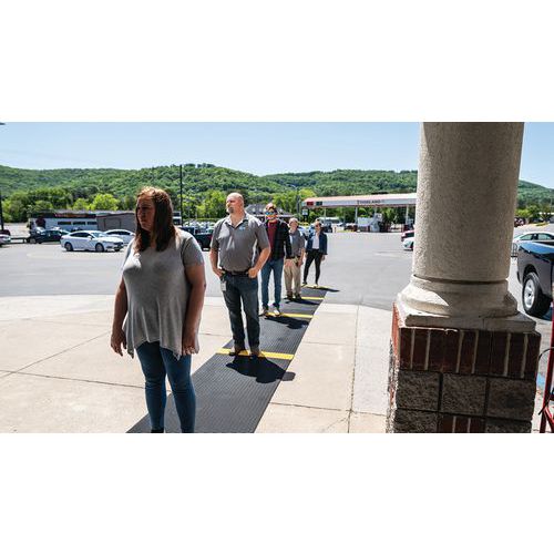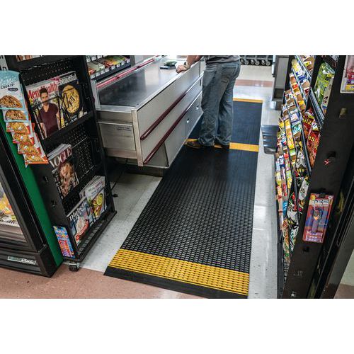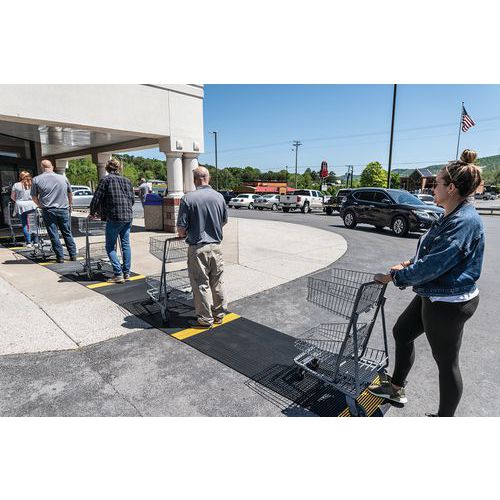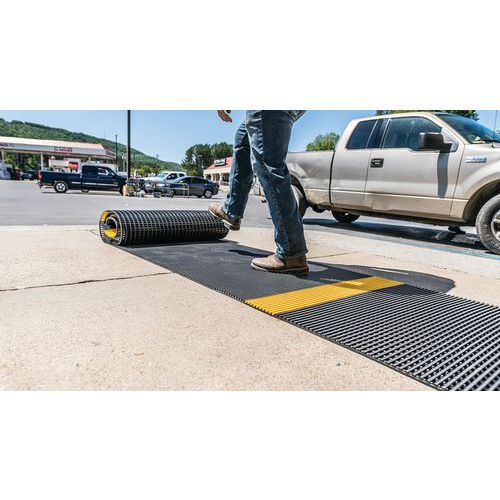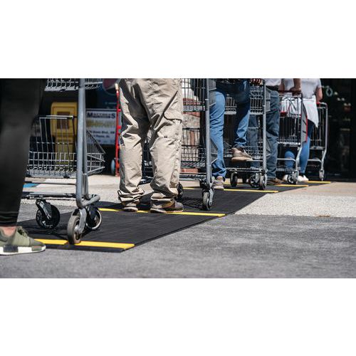 Plataforma gradeada em PVC flexível preto com banda amarela alternada de posicionamento para respeitar o distanciamento social. Excelente absorção acústica e extremamente confortável na posição em pé com cobertura das asperezas do solo. Fabrico em material PVC não poroso com resistência natural à acumulação de bactérias. Construção em duas camadas cruzadas com grelha aberta em PVC para uma excelente drenagem de líquidos. Limpeza extremamente simples: erguer ou enrolar para limpeza com mangueira de alta pressão. Mantenha confortavelmente o respeito das distâncias de segurança para os seus visitantes, clientes, funcionários