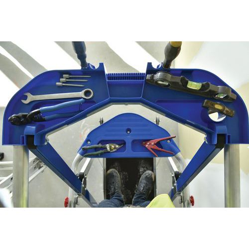 Inclui 2 prateleiras com compartimentos: 1 prateleira alta de grande capacidade com formato curvo para trabalhar o mais próximo possível da parede, equipada com 2 ganchos porta-baldes e pega de transporte integrada, 1 prateleira baixa adequada para bidões de 15 L.