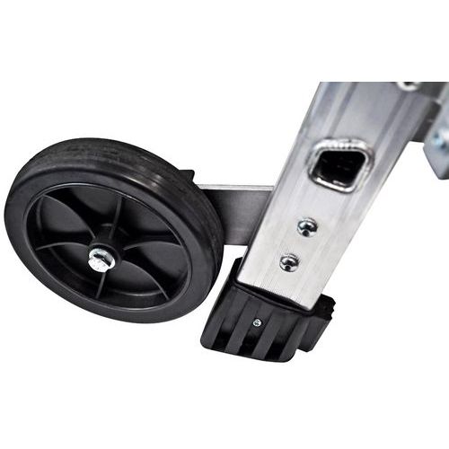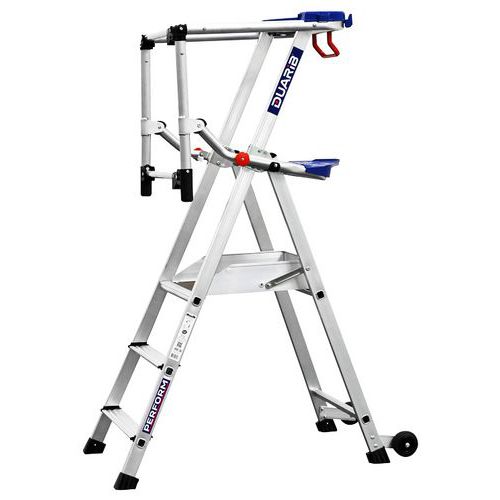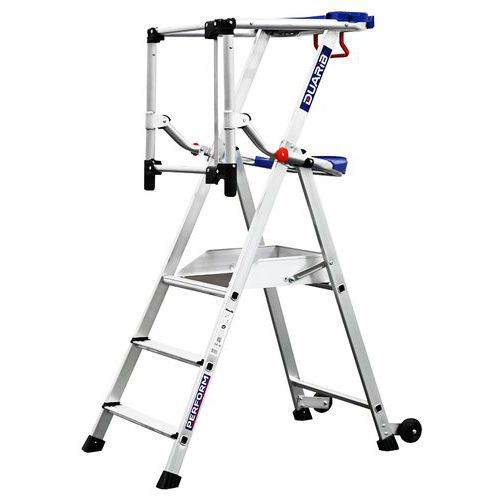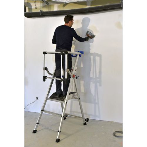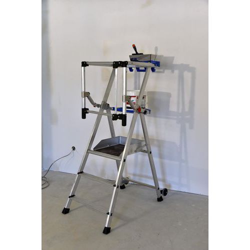 Plataforma individual fixa autoestável de nova geração em alumínio. Instalação rápida e fácil graças à montagem das balaustradas de segurança num só gesto. Elevada segurança graças à proteção da balaustrada de segurança articulada na parte traseira e fixação automática. Plataforma confortável e eficiente graças às 2 prateleiras de série com compartimentos. Degraus com 80 mm de largura para um acesso muito confortável.