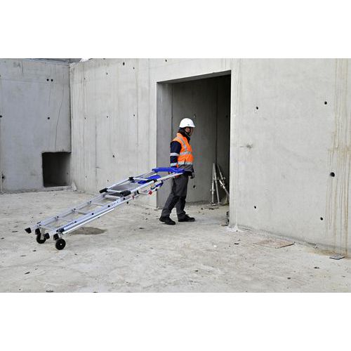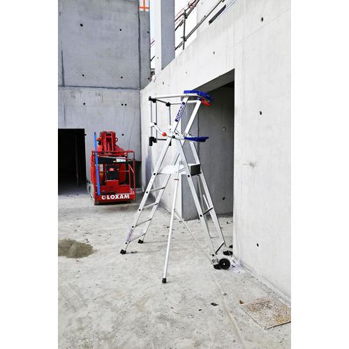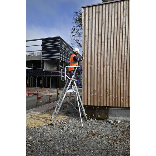 Plataforma individual fixa autoestável de nova geração em alumínio. Instalação rápida e fácil graças à montagem das balaustradas de segurança num só gesto. Elevada segurança graças à proteção da balaustrada de segurança articulada na parte traseira e fixação automática. Plataforma confortável e eficiente graças às 2 prateleiras de série com compartimentos. Degraus com 80 mm de largura para um acesso muito confortável.
