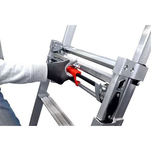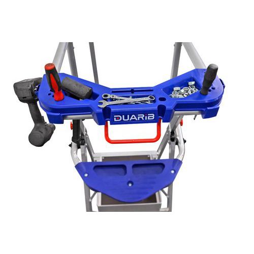 Prateleira inferior adequada para bidão de 15 litros. Dimensões dobradas otimizadas. Fácil de deslocar no estaleiro. Ajuste intuitivo da altura: planos deslizantes acionados por comando manual (patenteado) com bloqueio automático. Os estabilizadores de ajuste milimétrico são muito fáceis de instalar. Instalação em solos desnivelados.