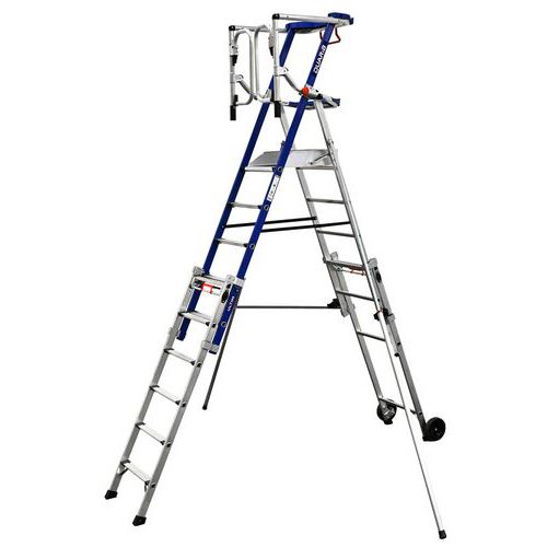 Plataforma telescópica em alumínio que oferece a possibilidade de trabalhar em várias alturas diferentes. Desdobragem instantânea. Acesso através de degraus antiderrapantes. Colocação da balaustrada de segurança com apenas um gesto. 2 prateleiras de série com compartimentos.
