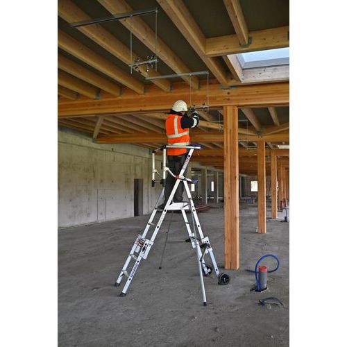Plataforma telescópica em alumínio que oferece a possibilidade de trabalhar em várias alturas diferentes. Desdobragem instantânea. Acesso através de degraus antiderrapantes. Colocação da balaustrada de segurança com apenas um gesto. 2 prateleiras de série com compartimentos.
