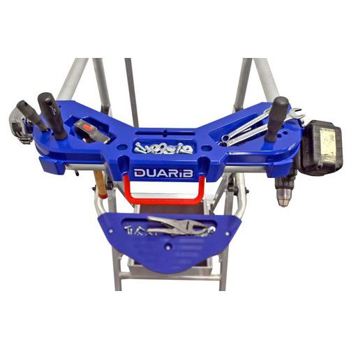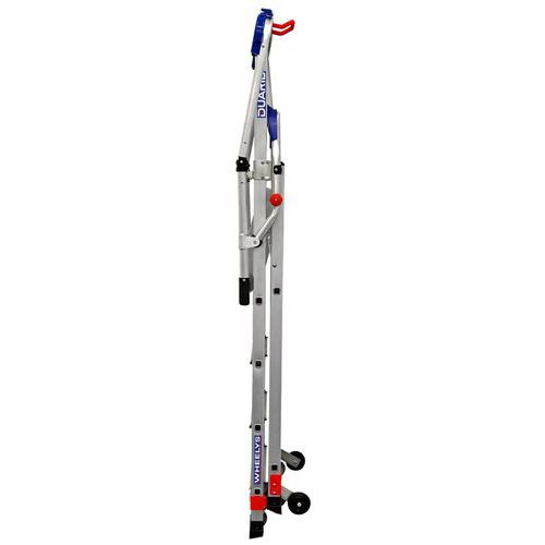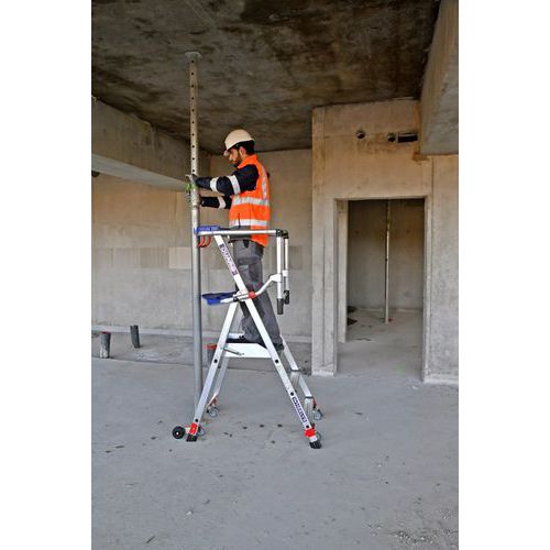 Plataforma individual em alumínio com altura fixa, extremamente móvel de nova geração. Colocação da balaustrada de segurança com apenas um gesto. Proteção traseira por balaustrada de segurança rígida e articulada. Confortável e eficiente graças às 2 prateleiras de série com compartimentos. Deslocação extremamente fácil em posição aberta, com 4 rodízios giratórios.