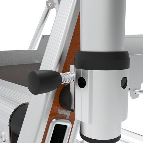 Plataforma móvel Veloce. Balaustrada de segurança rígida de 3 lados com correias de proteção traseiras contra quedas. Rodas escamoteáveis para uma mobilidade rápida e ideal. Degraus antiderrapantes de 80 mm. Inclui um porta-ferramentas amovível com compartimentos e com resistência de 25 kg com ganchos integrados (máximo de 10 kg). Piso antiderrapante de 500 x 400 mm em madeira de origem ecológica. Espaço de trabalho ergonómico. Estabilizadores retráteis com regulação milimétrica.