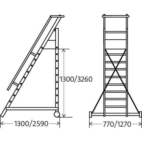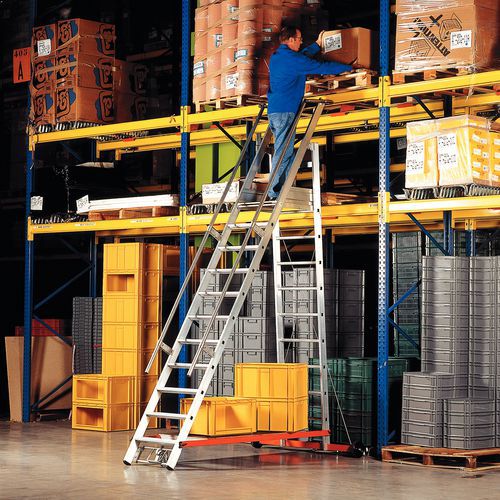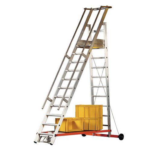 Plataforma móvel com degraus antiderrapantes. Confortável graças aos degraus amplos e estriados. Escada com 2 estabilizadores escamoteáveis. Rodapés de 150 mm de altura em 3 lados. Plataforma com roda escamoteável à frente.