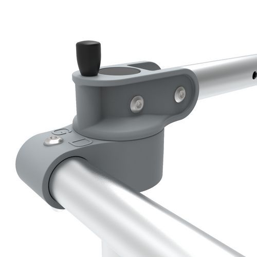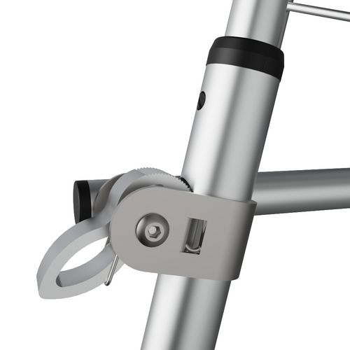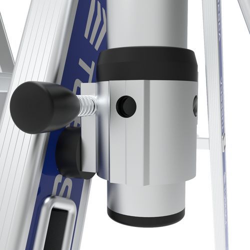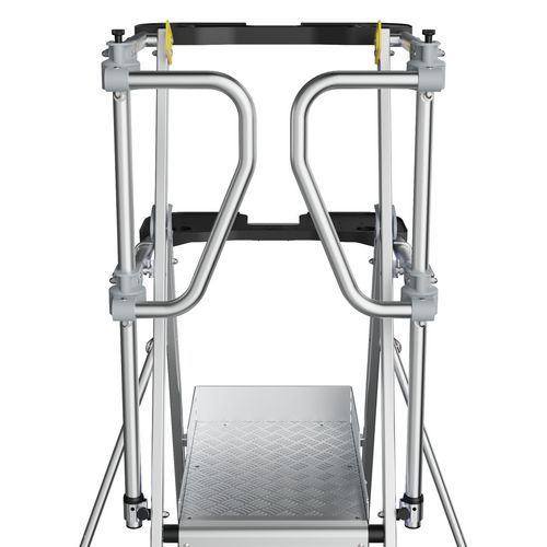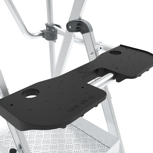 Plataforma Sherpascopic Saloon. Balaustrada de segurança rígida de 4 lados com portão tipo Saloon com fecho automático. Degraus antiderrapantes de 80 mm (plano fixo) e 60 mm (plano telescópico). Porta-ferramentas amovível com compartimentos e com resistência de 25 kg, com ganchos integrados (máximo de 10 kg). Prateleira XL com resistência de 25 kg. Piso antiderrapante com elevado conforto de 590 x 400 mm em alumínio. Espaço de trabalho ergonómico e confortável. Estabilizadores retráteis com regulação milimétrica. Sistema de regulação da altura intuitivo e seguro, regulação a cada 23 cm. Planos telescópicos que permitem a compensação de nível.