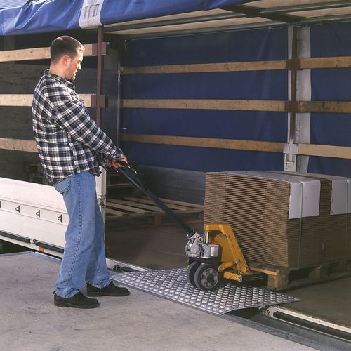 Para carregar e descarregar veículos com porta-paletes manuais, contentores móveis, carros de mão, etc.