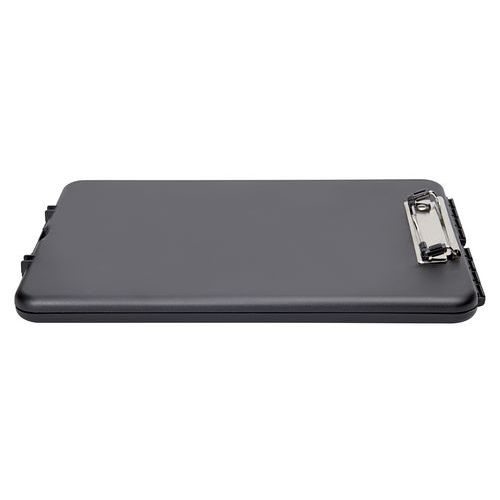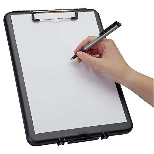 - Porta-blocos em plástico com plataforma sólida para escrita e compartimento de arrumação.
