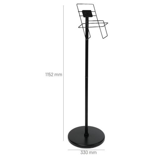 | Nome do artigo | Porta-brochuras A4 com pé preto em aço, N.º de prateleiras: 1, Cores: Preto, Largura total: 330 mm |