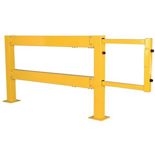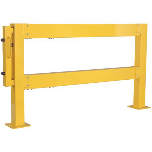 Sistema modular para proteger áreas no seu armazém. Porta corrediça com abertura e fecho simples e seguros graças aos puxadores integrados. Boa visibilidade graças à cor de sinalização em amarelo. Fácil instalação com placa 200x200 mm com 4 orifícios. Certificação TÜV.