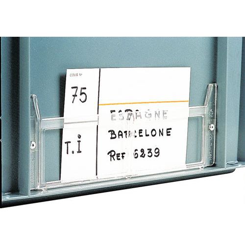 | Nome do artigo | Porta-etiqueta, P/ recipiente tipo: Caixa de norma europeia, Cores: Transparente, Tipo de fixação: De rebitar |