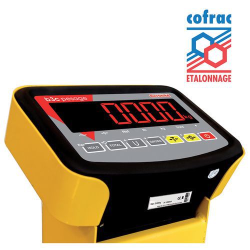 | Nome do artigo | Porta-paletes com balança e certificação COFRAC – capacidade de 2000 kg – B3C, Capacidade: 2000 kg |