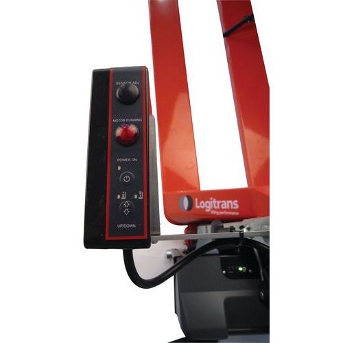 - Equipado por uma célula fotoelétrica, colocada num aro de proteção, munida de um temporizador regulável e orientável segundo a posição da carga no porta-paletes.