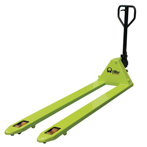 - Porta-paletes manual equipado com uma válvula de proteção que bloqueia a elevação dos garfos em caso de ultrapassagem da capacidade máxima de carga.