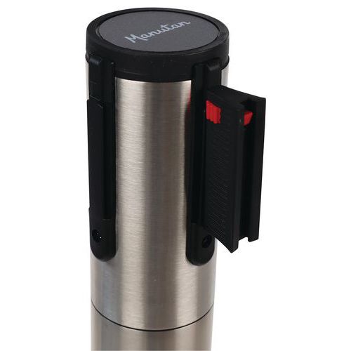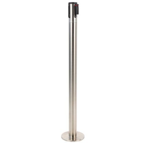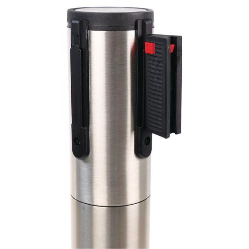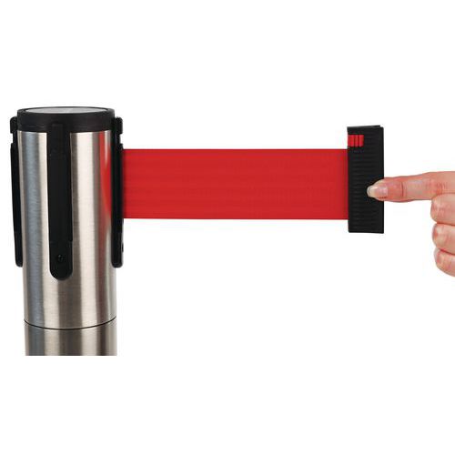 Poste com correia estirável e 3 pontos de fixação. Correia retrátil com sistema de travagem automática: não retrai de forma brusca em caso de desengate. Base equipada com patins de borracha para maior estabilidade. Permite reconfigurar facilmente as zonas de fluxo de clientes ou passageiros. Não é necessário mover o equipamento, basta manusear a parte superior do poste de orientação.