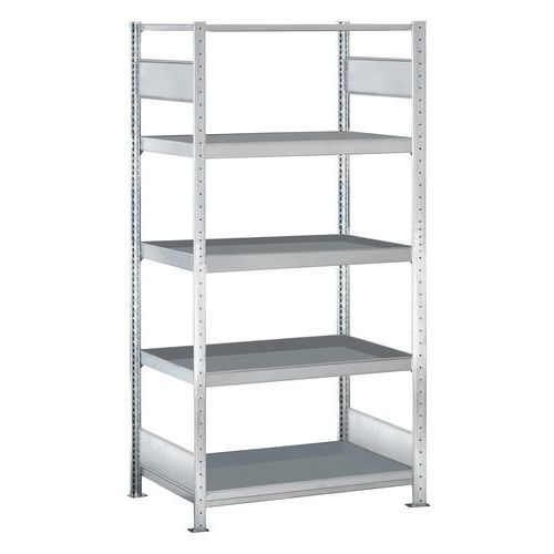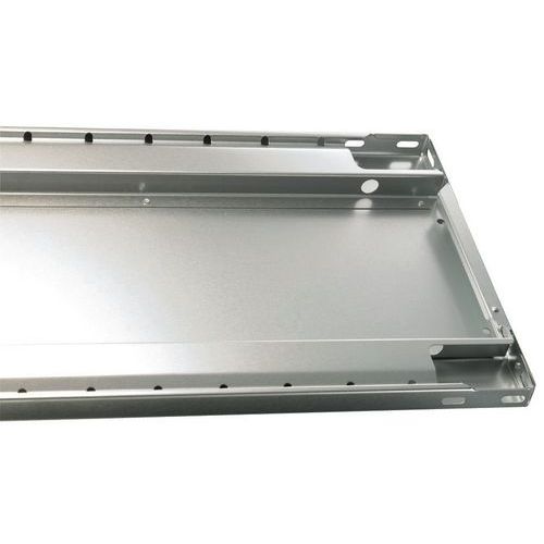 Prateleira galvanizada para estante de grande largura Easy-Fix Plus. Perfurações longitudinais consecutivas em ambos os lados para a colocação de divisórias. Permite adicionar rapidamente um nível para maior espaço de armazenamento. Prateleira em chapa para estante industrial, fácil de instalar e de fixar com a ajuda de simples montantes.