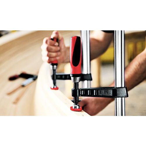 Resistência garantida por apoio e corrediça em ferro fundido. Proteções em plástico amovíveis sobre mordentes para as peças frágeis. Rótula no parafuso amovível e intercambiável sem ferramentas e sem esforços. Aperto seguro por travão de bloqueio integrado na corrediça. Pega em bimaterial para optimizar o conforto do trabalho.