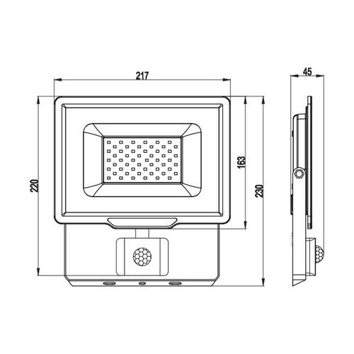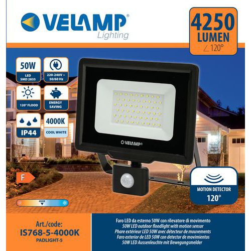 Projetor LED de 50 W com detetor de movimento – Velamp, Fluxo luminoso: 4250 lm, Potência: 50 W
