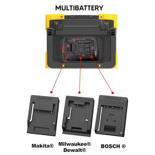 A lanterna de trabalho inclui 3 adaptadores para utilização com as seguintes 4 marcas de baterias: Bosch, Dewalt, Makita e Milwaukee.